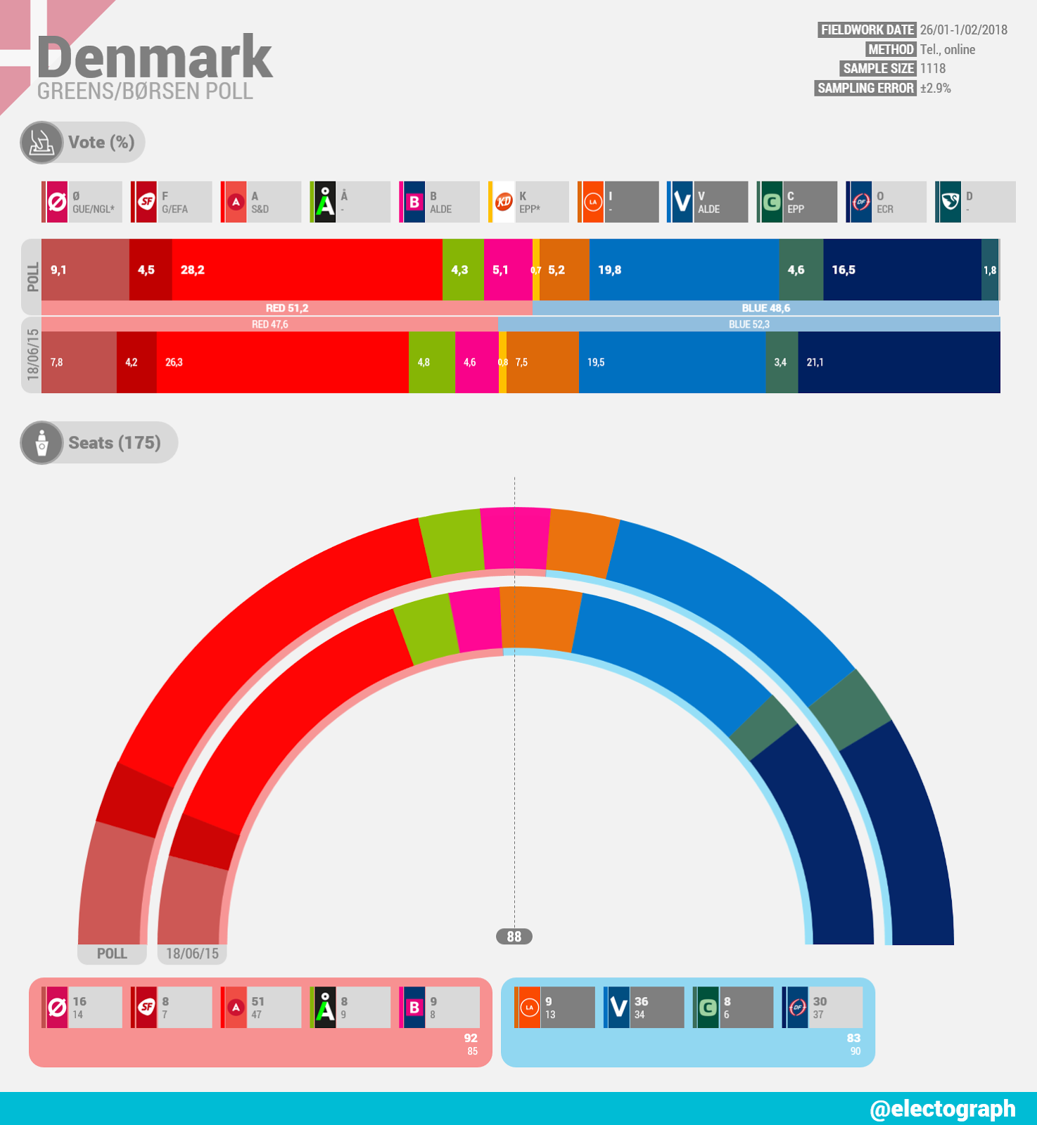 InicioDenmark DENMARK Greens poll for Børsen, February 2018 8.2.18 Ø 9.1% (16), F 4.5% (8), A 28.2% (51), Å 4.3% (8), B 5.1% (9), K 0.7%, I 5.2% (9), V 19.8% (36), C 4.6% (8), O 16.5% (30), D 1.8% Source | Parties Etiquetas Denmark Greens Facebook Twitter