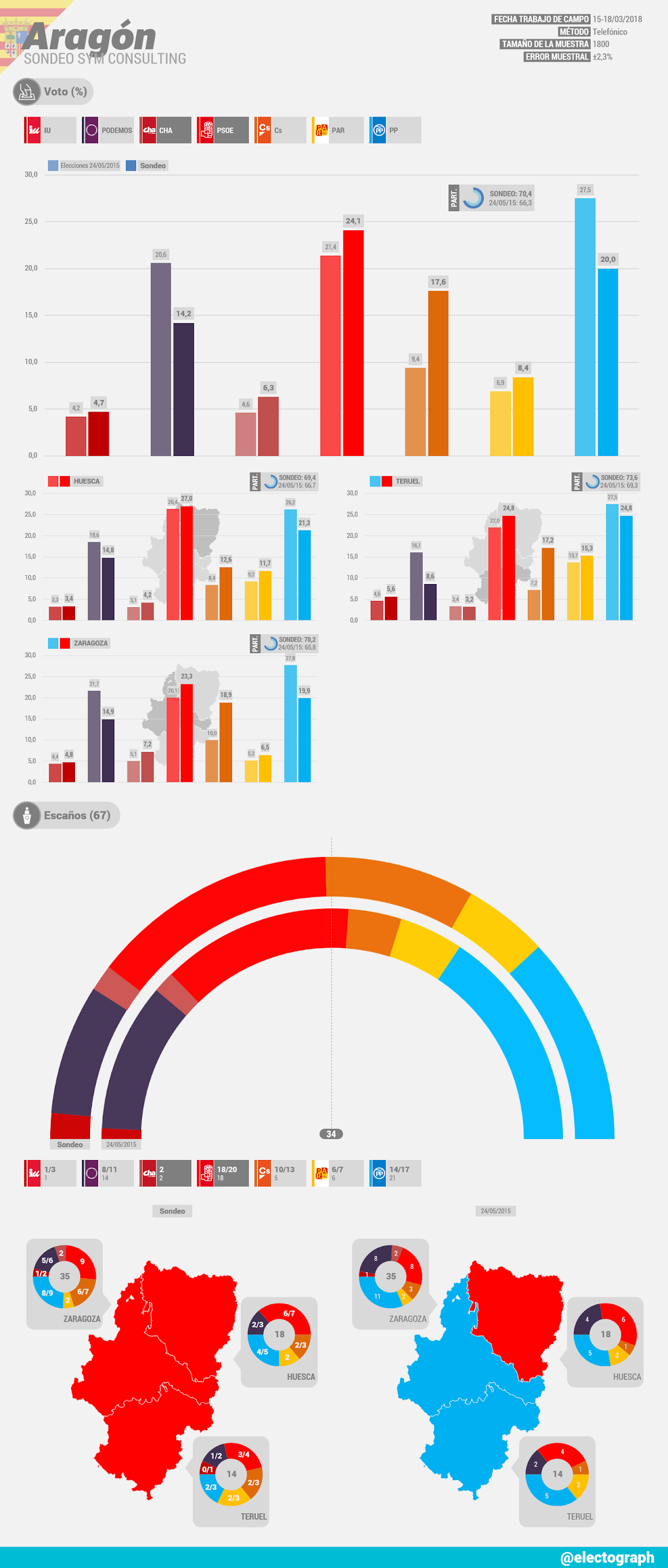 Los socialistas crecerían en casi 3 puntos porcentuales y sumarían hasta 2 escaños más a los 18 que tienen ahora. Volverían así a ser la primera fuerza política de la comunidad aragonesa con una ventaja de 4 puntos sobre el Partido Popular, que sufriría un notable retroceso de 7 puntos y medio. Esta bajada se traduciría en la pérdida de entre 4 y 7 diputados. En tercer lugar se situaría Ciudadanos. La formación liberal obtendría hasta 8 puntos más de respaldo en las urnas y una horquilla de entre 10 y 13 escaños en las Cortes que le situaría como la tercera fuerza política por delante de un Podemos mermado en apoyo popular -6 puntos menos- y en escaños -de 14 pasaría a 8/11-. Este intercambio de posiciones haría posible que el centroderecha se convirtiera en mayoritario. Los regionalistas del Partido Aragonés también registrarían un crecimiento que podría plasmarse en un diputado más. Izquierda Unida podría conseguir hasta 3 escaños. La Chunta mantendría sus 2 asientos.
