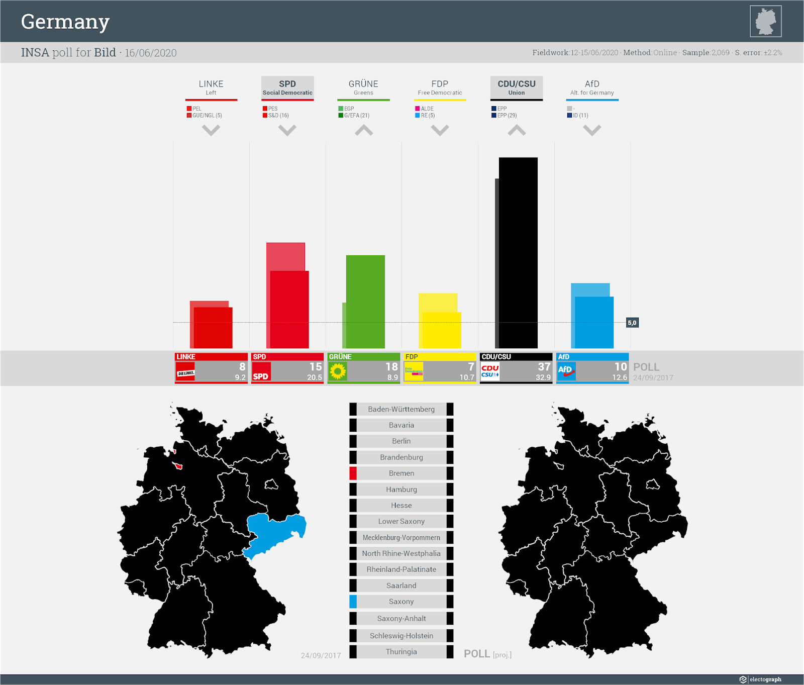 InicioGermany GERMANY · INSA poll 16/06/2020: LINKE 8%, SPD 15%, GRÜNE 18%, FDP 7%, CDU/CSU 37%, AfD 10% 16.6.20 Poll results: LINKE 8%, SPD 15%, GRÜNE 18%, FDP 7%, CDU/CSU 37%, AfD 10% Map credit: By Erinthecute - Own work, CC BY-SA 4.0, Link. Adapted by electograph. Source | Parties Etiquetas Germany INSA Facebook Twitter