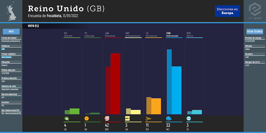InicioFocaldata REINO UNIDO (GB) · Encuesta Focaldata 13/01/2022: GP 4% | PC 1% | LAB 42% | SNP 3% | LD 11% | CON 33% | RUK 3% 13.1.22 GP 4% | PC 1% | LAB 42% | SNP 3% | LD 11% | CON 33% | RUK 3% Encuesta para elecciones generales en Reino Unido realizada por Focaldata. Fuente | Partidos Etiquetas Focaldata United Kingdom Facebook Twitter